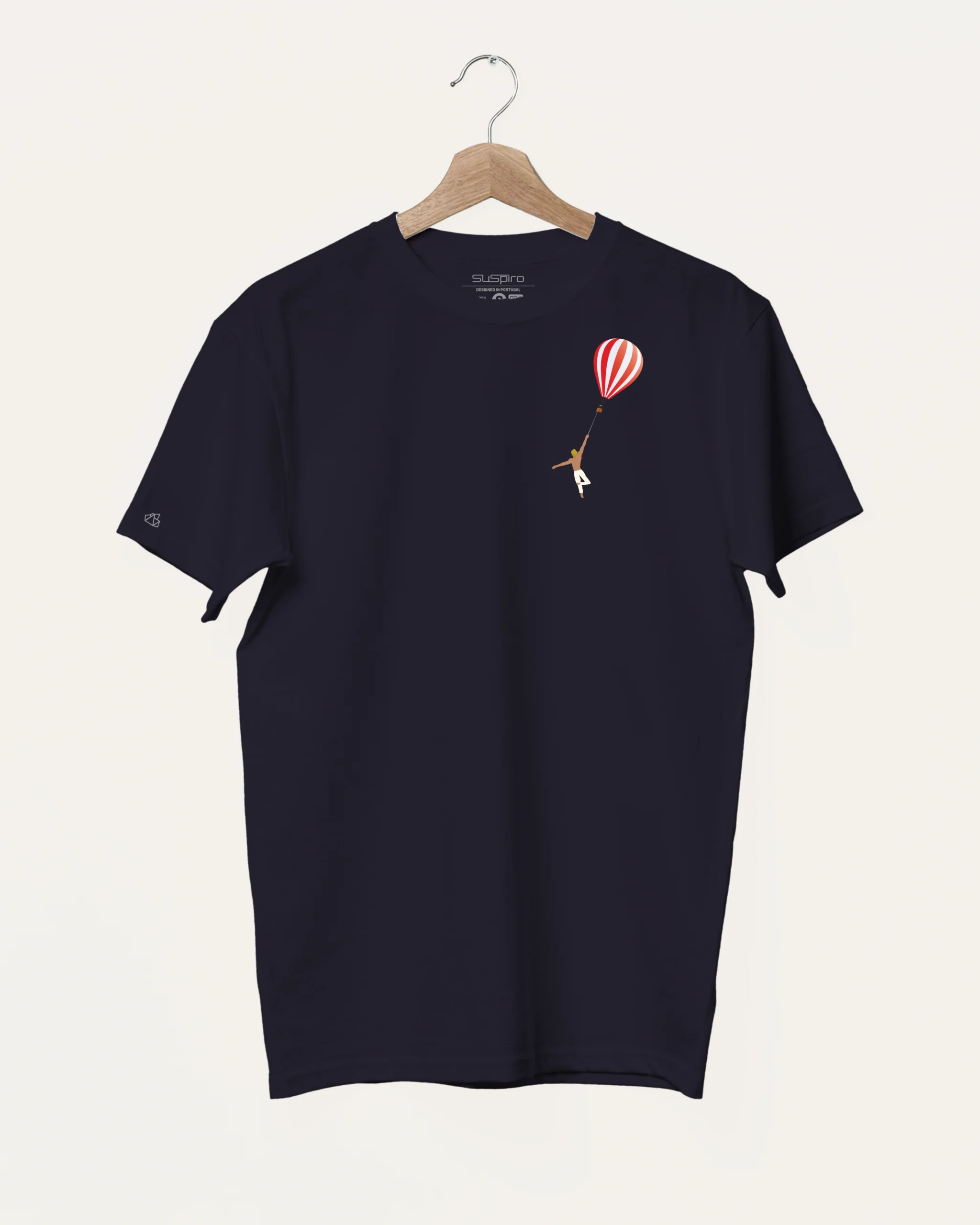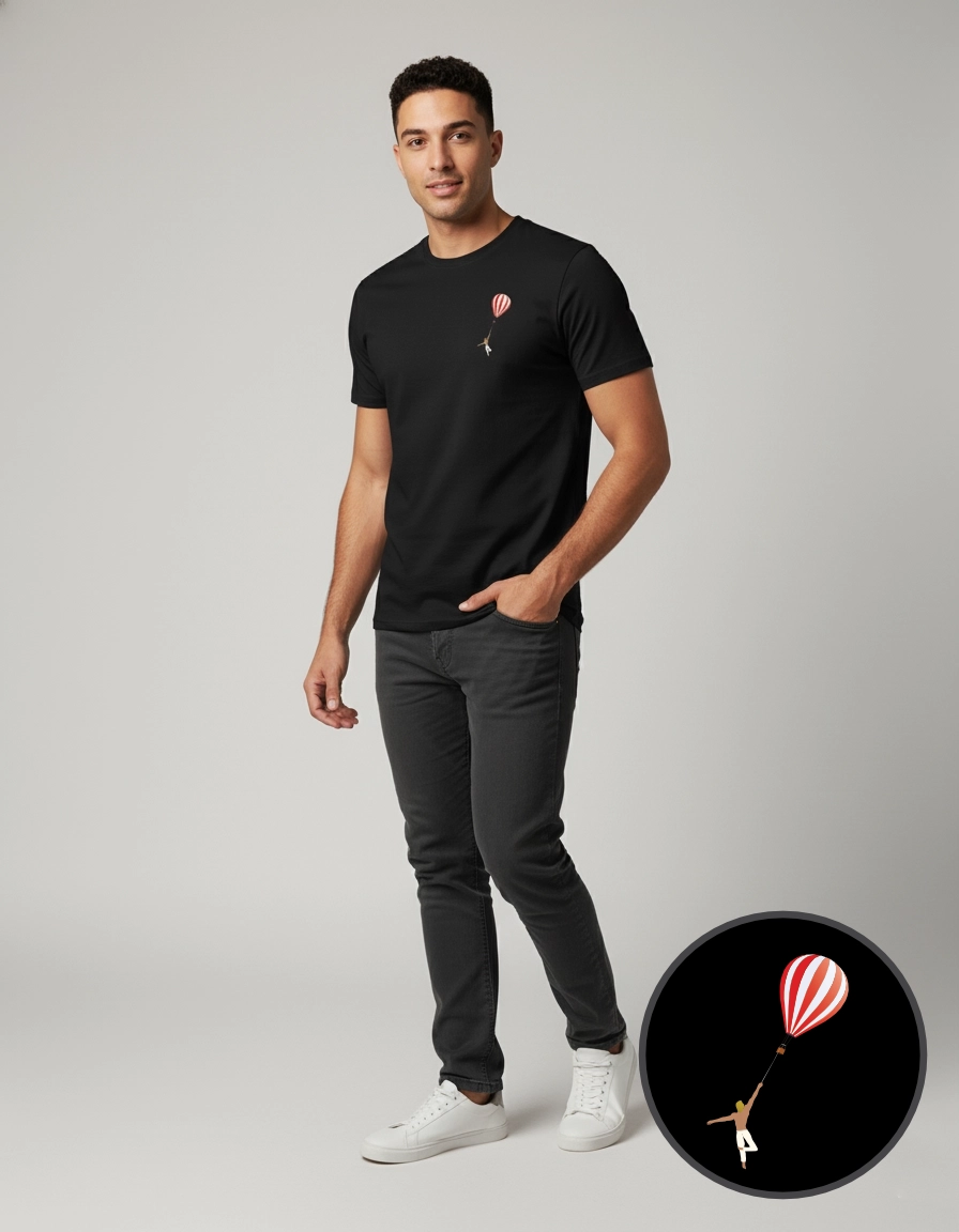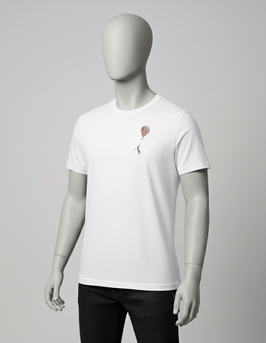 Esta t-shirt apresenta um design poético de um homem a flutuar, suspenso por um balão, mas firmemente ligado a ele por uma corda. A imagem evoca a coragem de alçar voo em direção aos sonhos, reconhecendo que, por vezes, a própria ligação é o que permite a subida. É uma poderosa metáfora visual sobre a liberdade responsável e o poder dos laços — seja com um propósito, uma pessoa, ou a terra firme.