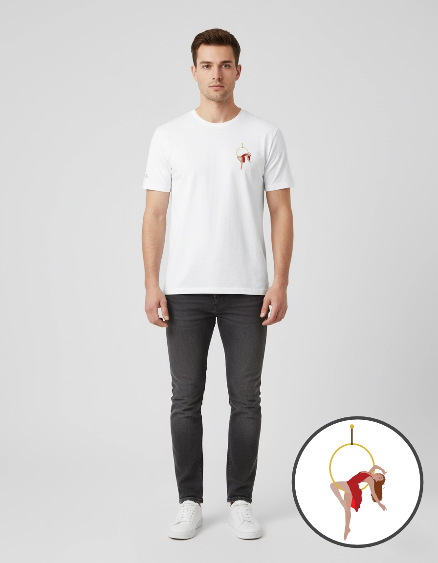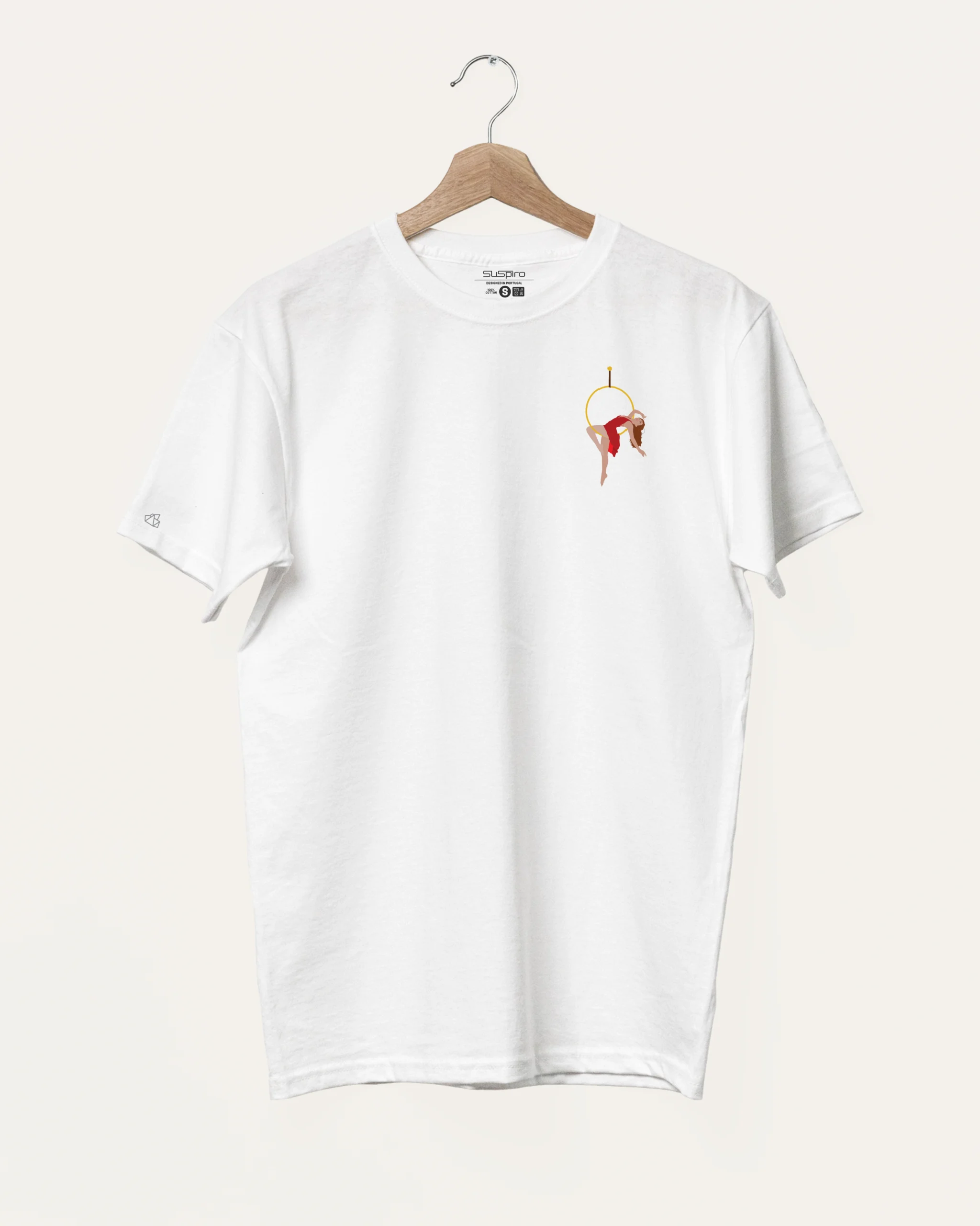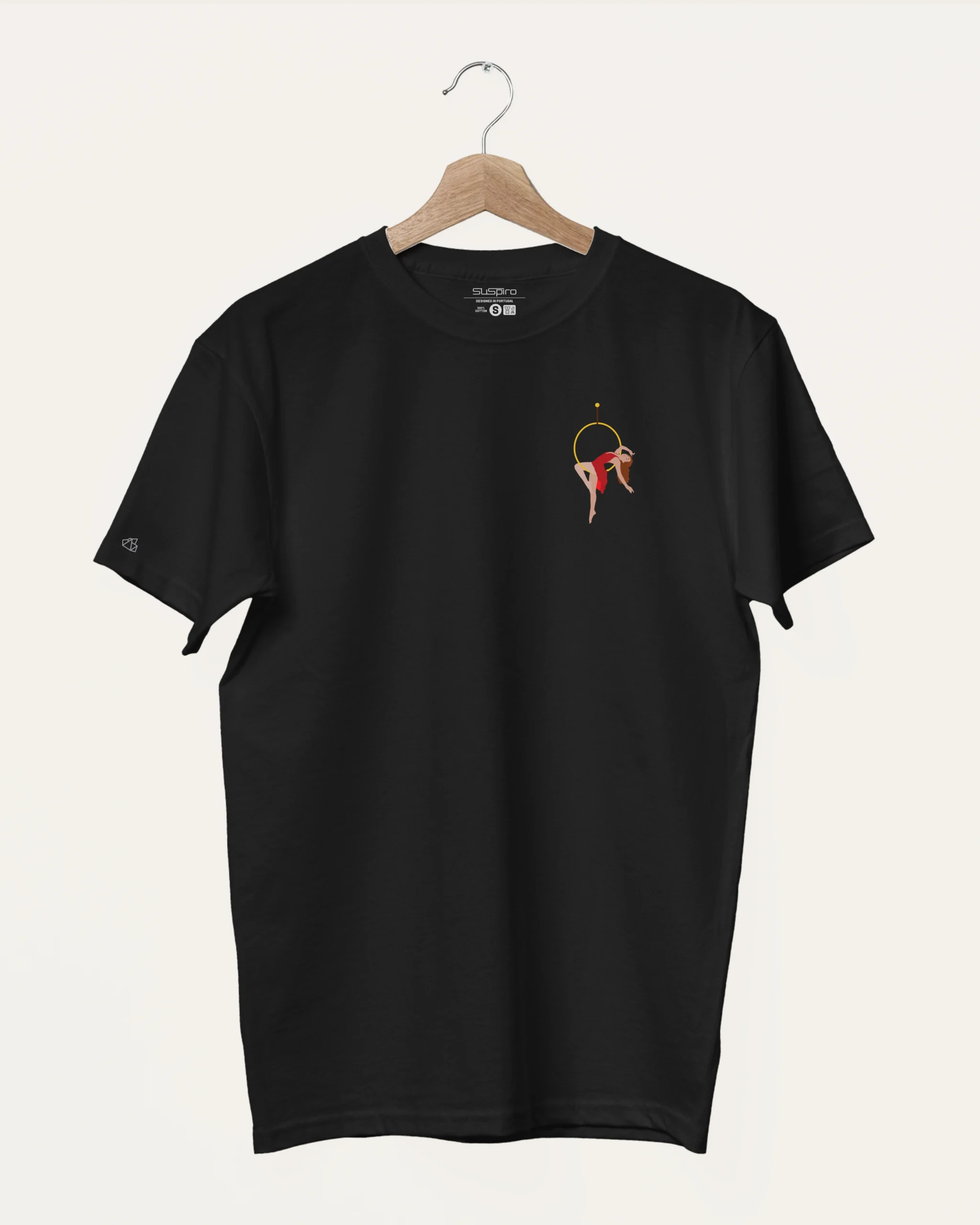 Esta t-shirt apresenta um design visualmente deslumbrante de uma acrobata a dominar o aro aéreo. A estampa capta a fluidez do movimento, a intensidade do foco e a beleza da forma humana em suspensão. É uma verdadeira homenagem à arte do circo contemporâneo e à força feminina que se manifesta com leveza e precisão.