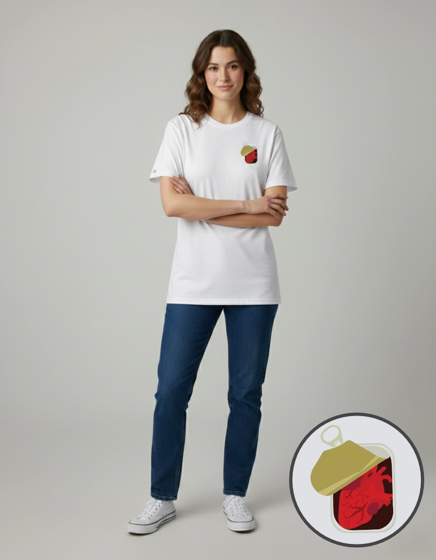 A t-shirt Coração Enlatado é a peça ideal para quem gosta de um estilo com atitude e um toque de ironia. O detalhe do coração vermelho, preservado e à vista num recipiente (boião/lata) cria um statement visual único e memorável.